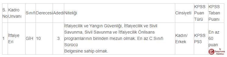 a) İlan edilen itfaiye eri kadro unvanı için mezun olunan okul itibarıyla öğrenim şartını taşımak ve bu öğrenimle ilgili olarak 2020 yılı Kamu Personel Seçme Sınavından (KPSS) alım yapılacak kadronun karşısındaki puan türlerinden, belirtilen asgari KPSS puanını almış olmak.