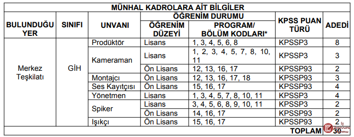 Diyanet İşleri Başkanlığımız Merkez Teşkilatında münhal bulunan; aşağıda unvanı, sınıfı ve öğrenim durumu belirtilen toplam 30 (otuz) kadroya sözlü sınav sonucuna göre açıktan atama yapılacaktır. Sözlü sınava 2020 yılı KPSS puan sırası esas alınarak tabloda belirtilen boş kadro sayısının 3 (üç) katı aday çağrılacaktır.
