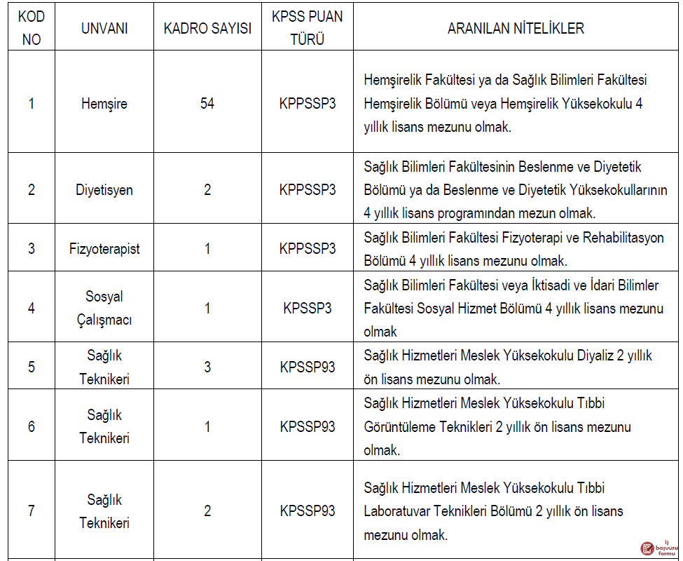 (1) Lisans mezunları için 2020 yılı KPSS sınavından KPSSP3 puan türüne, ön lisans mezunları için 2020 yılı KPSSP93 , lise veya dengi mezunları için 2020 KPSSP94 puan türüne bakılacaktır. Adayların başvurularını nüfus cüzdanı, diplomalarının arkalı -önlü ve/ veya geçici mezuniyet belgesini, KPSS sonuç belgesi (internet ortamında alınan sonuç belgesi yeterlidir) ve erkek adaylar için askerlik belgesini ilgili unvanda varsa talep edilen sertifika, çalışma belgesi, vb. ile birlikte gazetedeki ilan tarihinden itibaren 15 gün içinde http://www.hastane.hacettepe.edu.tr/ adresinden internet ortamında başvurularını yapmaları gerekmektedir.
